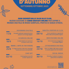 Ogni giovedì dalle 20:30 alle 22:30 nuovi corsi gratuiti online per capire il mondo digitale in modo semplice, pratico e senza stress.