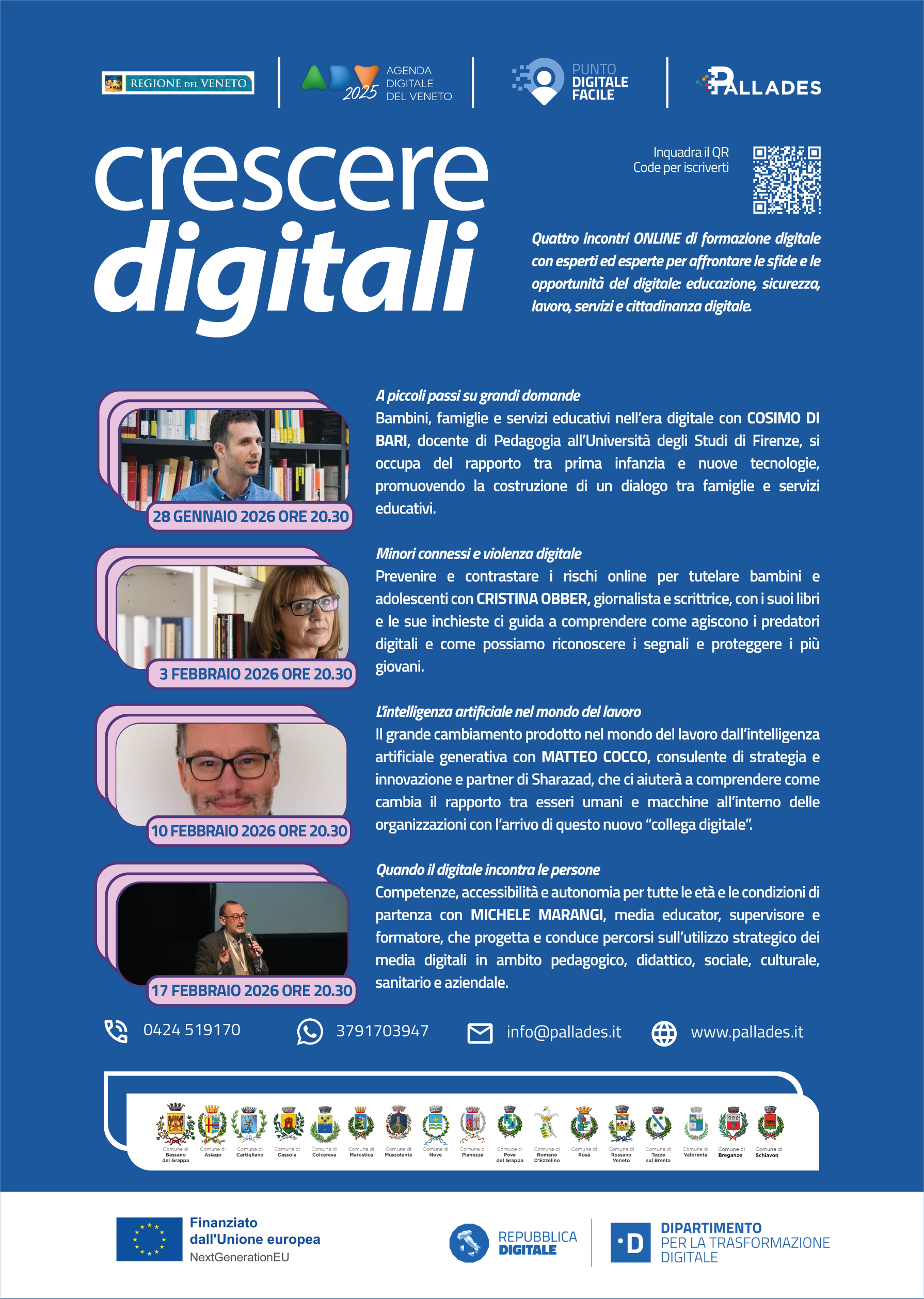 Quattro incontri online, ognuno dedicato a una specifica fascia d'età, con esperti ed esperte per affrontare le sfide e le opportunità del digitale: educazione, sicurezza, lavoro, servizi e cittadinanza digitale.