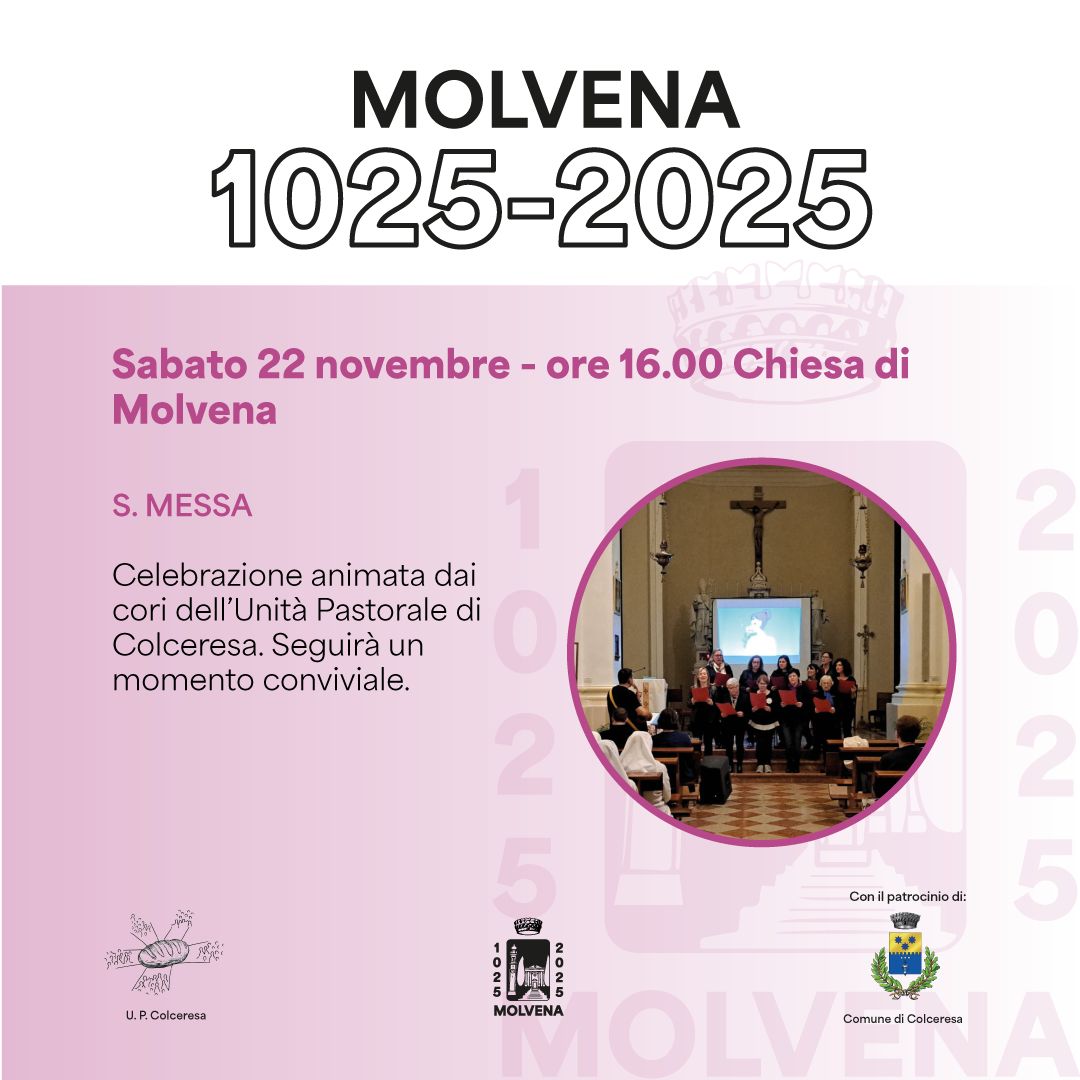 Nell'ambito delle iniziative per celebrare i 1000 anni di Molvena, sabato 22 novembre 2025 alle 16.00 presso la Chiesa di Molvena, sarà celebrata la Santa Messa animata dai cori dell'Unità Pastorale di Colceresa.