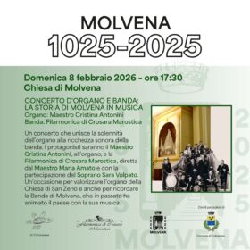 Nell'ambito delle iniziative per celebrare i 1000 anni di Molvena, domenica 8 febbraio 2026 alle 17.30 presso la Chiesa di Molvena si terrà un concerto del Maestro organista Cristina Antonini, con la partecipazione della Filarmonica di Crosara Marostica diretta dal Maestro Maria Amato e del soprano Sara Volpato.