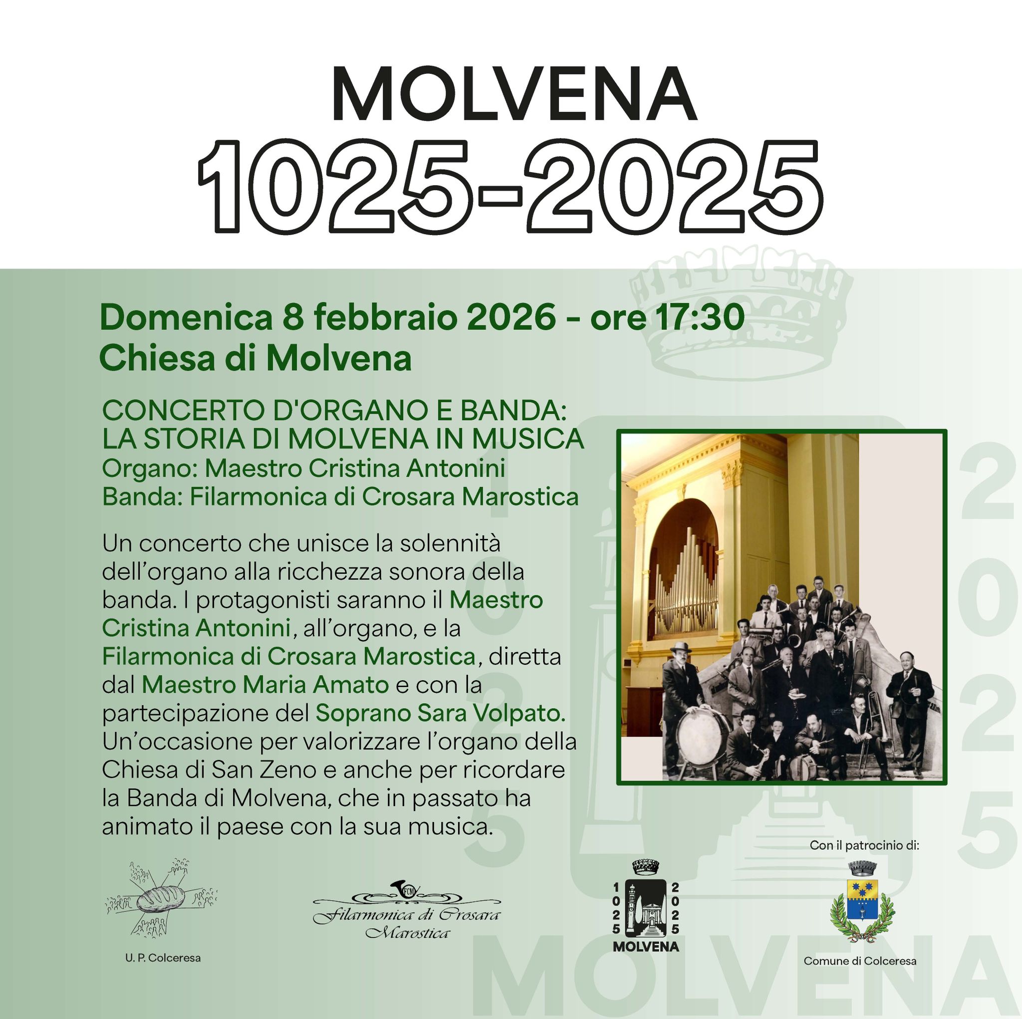 Nell'ambito delle iniziative per celebrare i 1000 anni di Molvena, domenica 8 febbraio 2026 alle 17.30 presso la Chiesa di Molvena si terrà un concerto del Maestro organista Cristina Antonini, con la partecipazione della Filarmonica di Crosara Marostica diretta dal Maestro Maria Amato e del soprano Sara Volpato.