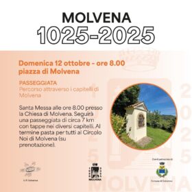 Nell'ambito delle iniziative per celebrare i 1000 anni di Molvena, domenica 12 ottobre 2025, è prevista una passeggiata di circa 7 chilometri con tappe nei diversi capitelli di Molvena. Al termine pasta per tutti al Circolo Noi di Molvena, su prenotazione.