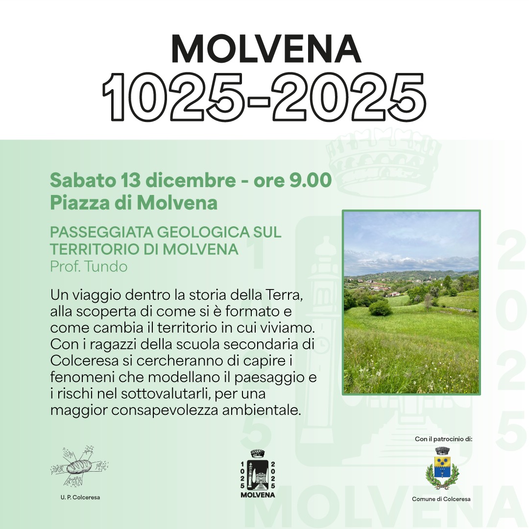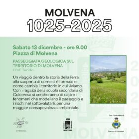 Nell'ambito delle iniziative per celebrare i 1000 anni di Molvena, sabato 13 dicembre 2025 alle 9.00 con ritrovo presso la Piazza di Molvena, passeggiata geologica alla scoperta di come si è formato e come cambia il territorio in cui viviamo.