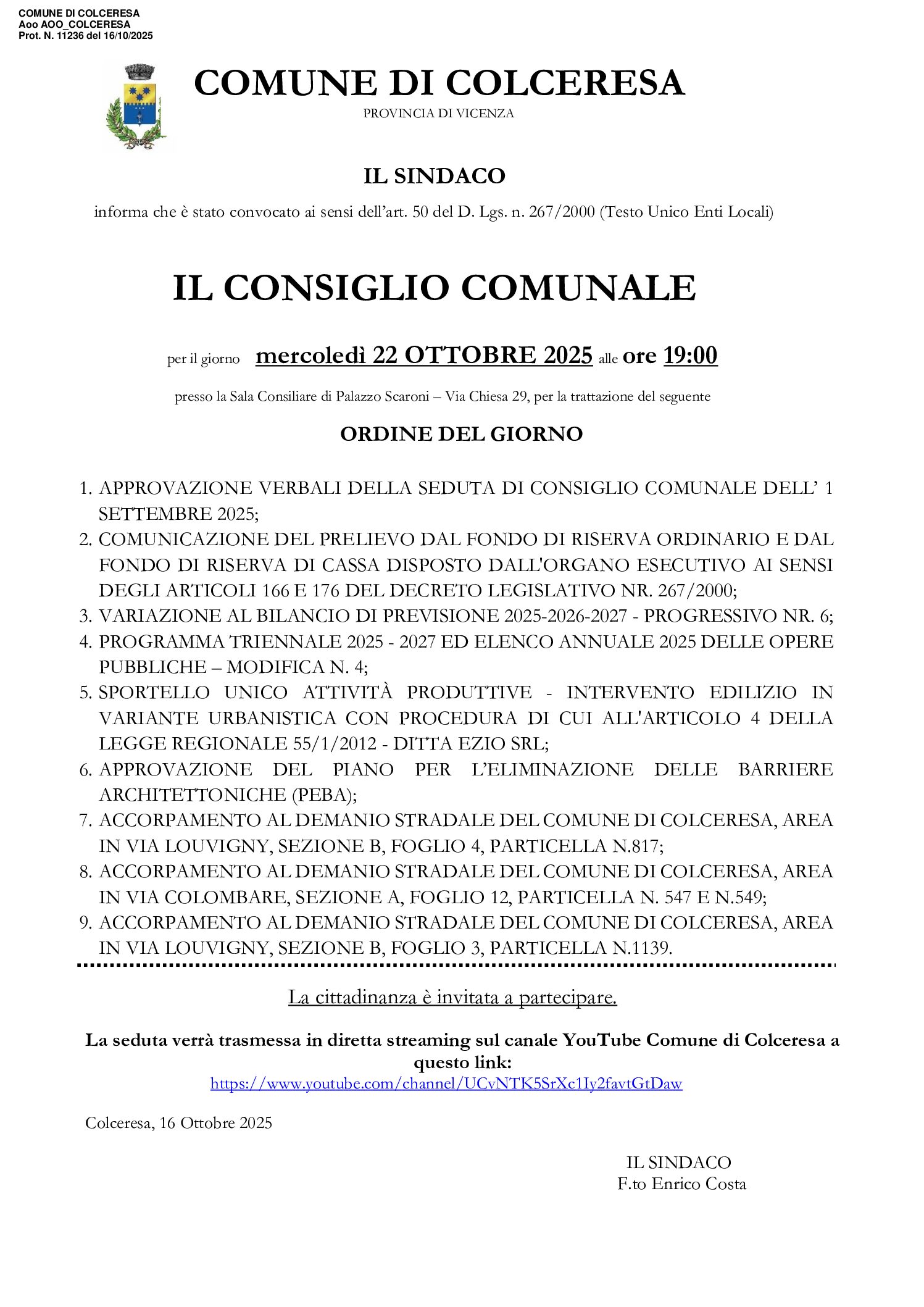 Il Consiglio Comunale è convocato per mercoledì 22 ottobre alle ore 19.00 presso la Sala Consiliare di Palazzo Scaroni.