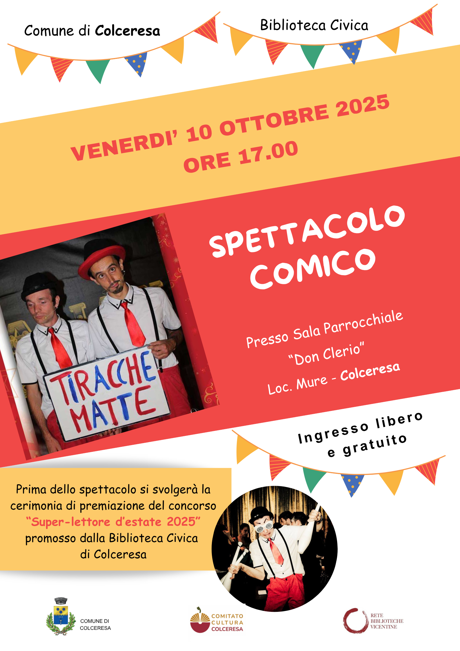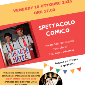 Venerdì 10 ottobre alle ore 17.00 presso la Sala Parrocchiale "Don Clerio" in loc. Mure di Colceresa, si terrà uno spettacolo comico del duo "Tiracche Matte".